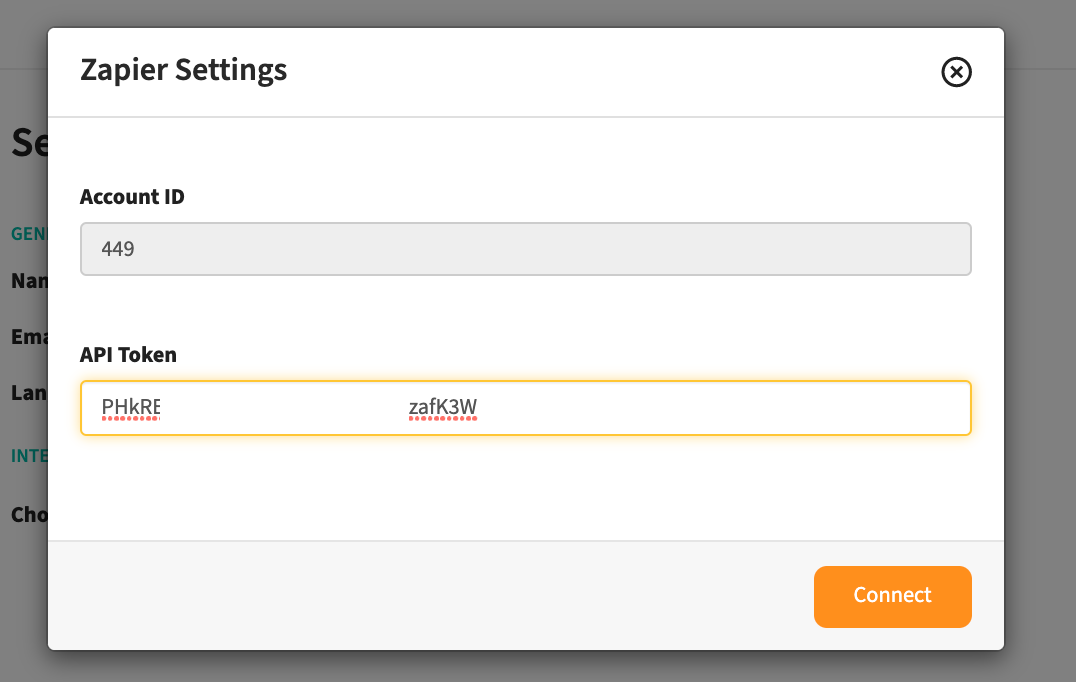 Then go to your settings in Goava and select Zapier from the integration dropdown and click Get configurations. Then you'll see a box like the one below showing your account ID and an API token, copy the API token (you'll need this again soon), and then click Connect.
