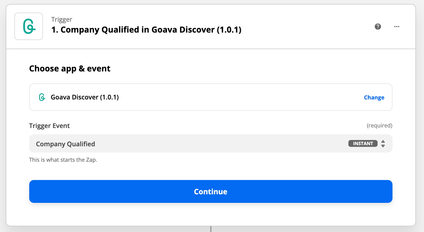 Now let's start creating your Zap! We'll guide you through how to set up a zap that Exports from Goava to whichever system you want to connect it with. Create a new Zap in Zapier and select Company Qualified as your Trigger event.
