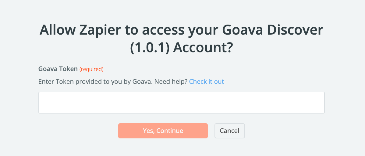 Then add a new Goava Account and enter the API token that you copied earlier here. If you have lost your API token or want to reconnect your Goava account you can always generate a new API token by going to your settings in Goava, disconnecting from Zapier, and then connecting again and it will generate a new token.