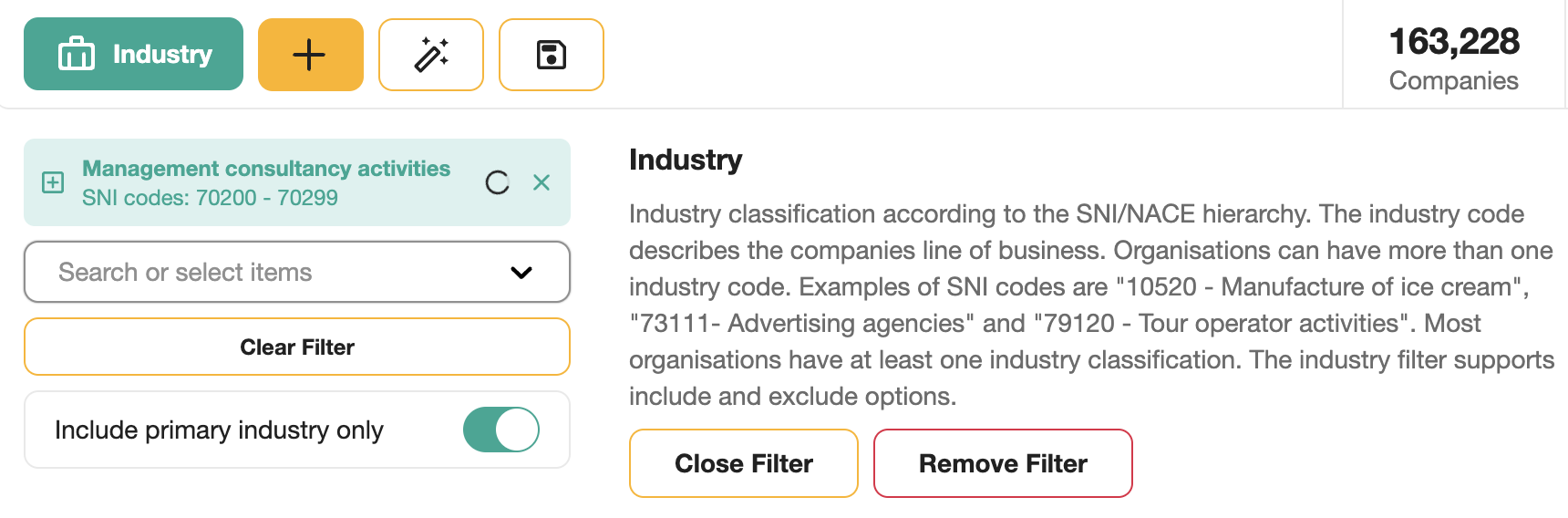 You can now toggle the Include primary industry only box in industry filter to only include companies that has your selected industry as their primary industry.