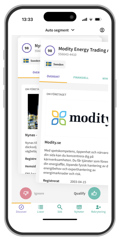 Under fliken Discover längst ner i appen hittar du Pings prospektering, och precis som i desktop väljer man att antingen kvalificera eller ignorera ett företag för att komma vidare. Enda skillnaden: